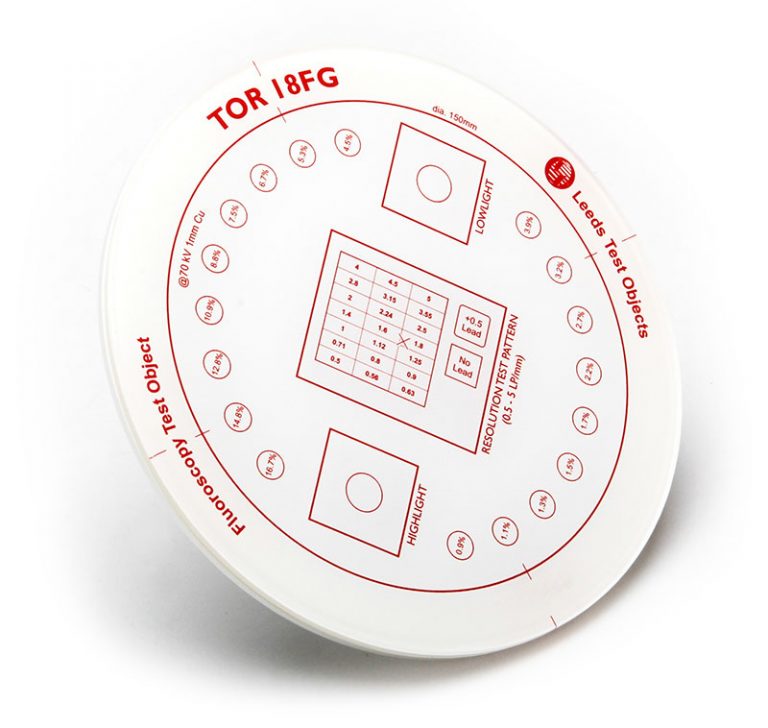 TOR 18FG fluoroscopy phantom is a routine test object designed to be used quickly and easily on a regular basis (e.g. weekly/monthly) to provide an ongoing check of imaging performance, particularly those aspects which are most liable to deterioration. After an initial grey-scale check, image quality is measured simply by counting the number of details detected and the number of bar-patterns resolved in the image. An ongoing record of these numbers will reveal any trend towards deterioration in imaging performance.